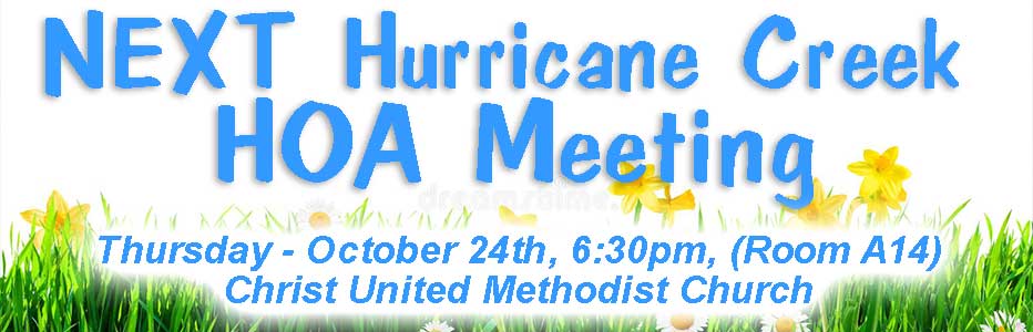 During our meeting, you'll be introduced to the HOA Board of Directors, hear updates on several key projects, and we'll save time at the end for your questions. Thank you for your support in helping to continue to make Hurricane Creek a GREAT place to live! We look forward to seeing you soon.